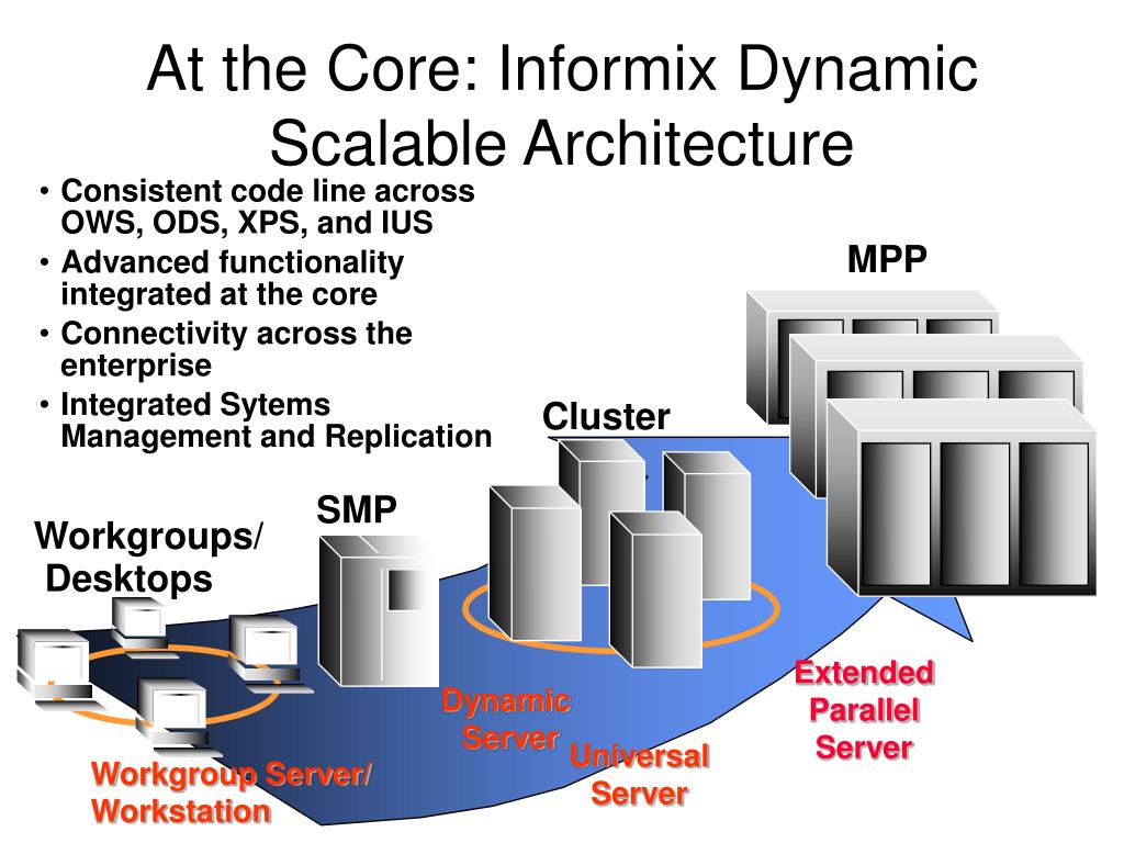 At the Core: Informix Dynamic Scalable Architecture • Consistent code line across OWS, ODS, XPS, and IUS • Advanced functionality integrated at the core • Connectivity across the enterprise • Integrated Sytems Management and Replication MPP Cluster SMP Massively Parallel Workgroups/ Desktops Cluster Extended Parallel Server Dynamic Server SMP Universal Server Workgroup Server/ Workstation Workgroups