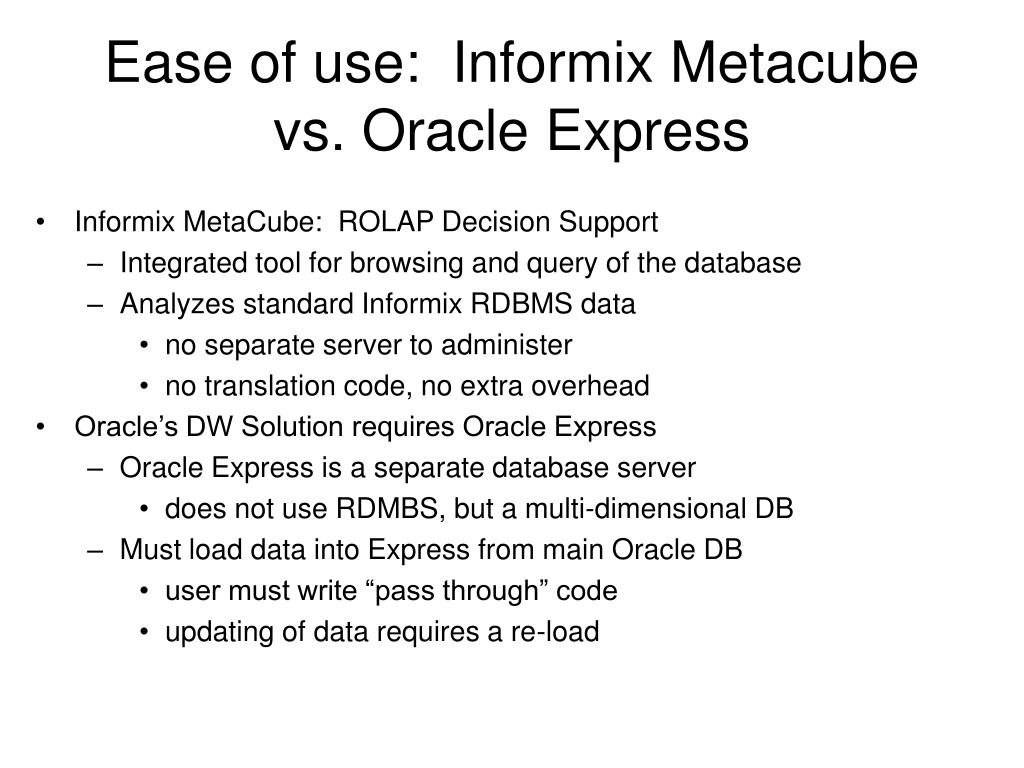 Ease of use: Informix Metacube vs. Oracle Express • Informix MetaCube: ROLAP Decision Support • Integrated tool for browsing and query of the database • Analyzes standard Informix RDBMS data • no separate server to administer • no translation code, no extra overhead • Oracle’s DW Solution requires Oracle Express • Oracle Express is a separate database server • does not use RDMBS, but a multi-dimensional DB • Must load data into Express from main Oracle DB • user must write “pass through” code • updating of data requires a re-load