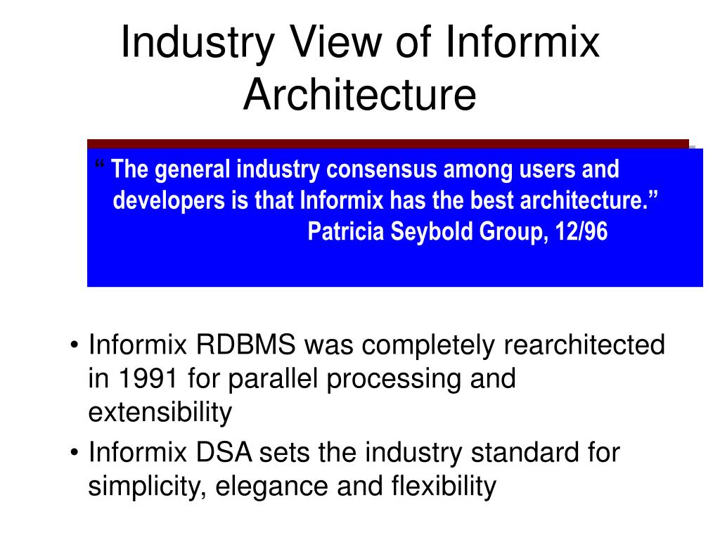 Industry View of Informix Architecture • Informix RDBMS was completely rearchitected in 1991 for parallel processing and extensibility • Informix DSA sets the industry standard for simplicity, elegance and flexibility “ The general industry consensus among users and developers is that Informix has the best architecture.” Patricia Seybold Group, 12/96