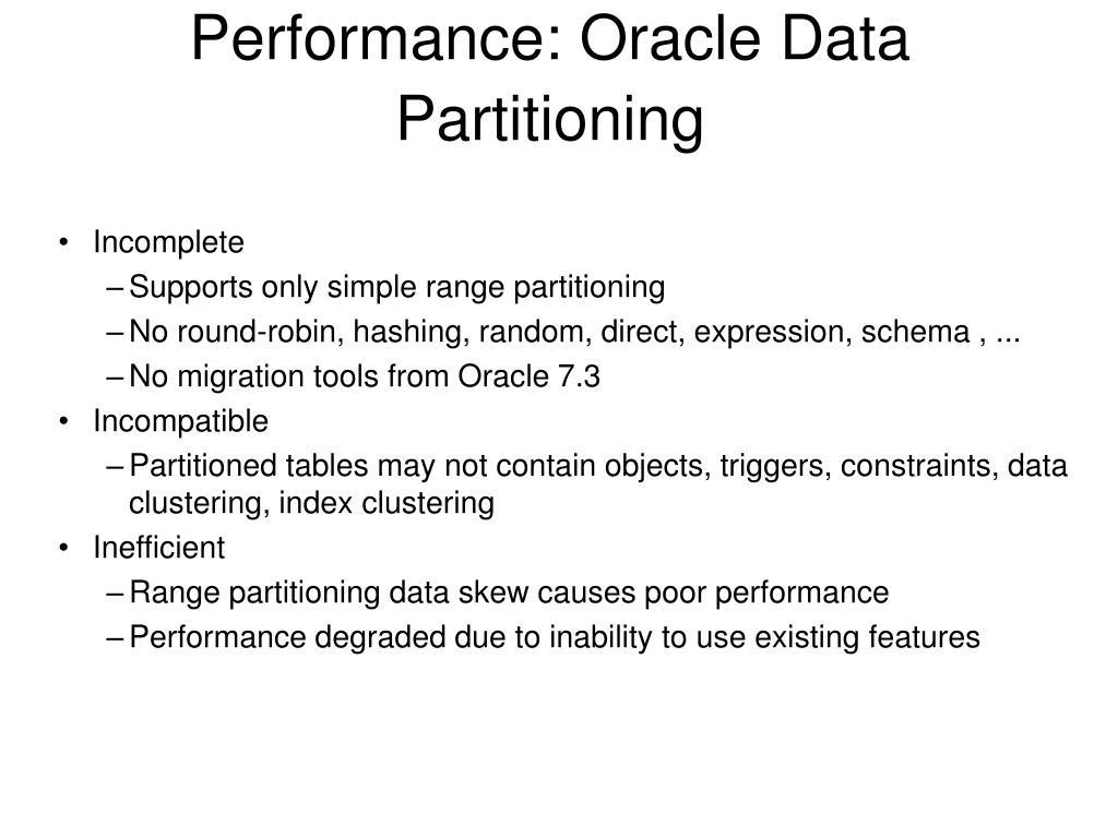Performance: Oracle Data Partitioning • Incomplete • Supports only simple range partitioning • No round-robin, hashing, random, direct, expression, schema , ... • No migration tools from Oracle 7.3 • Incompatible • Partitioned tables may not contain objects, triggers, constraints, data clustering, index clustering • Inefficient • Range partitioning data skew causes poor performance • Performance degraded due to inability to use existing features