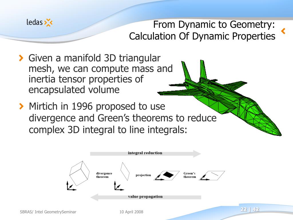From Dynamic to Geometry: Calculation Of Dynamic Properties • Given a manifold 3D triangular mesh, we can compute mass and inertia tensor properties of encapsulated volume • Mirtich in 1996 proposed to use divergence and Green’s theorems to reduce complex 3D integral to line integrals: SBRAS/ Intel GeometrySeminar