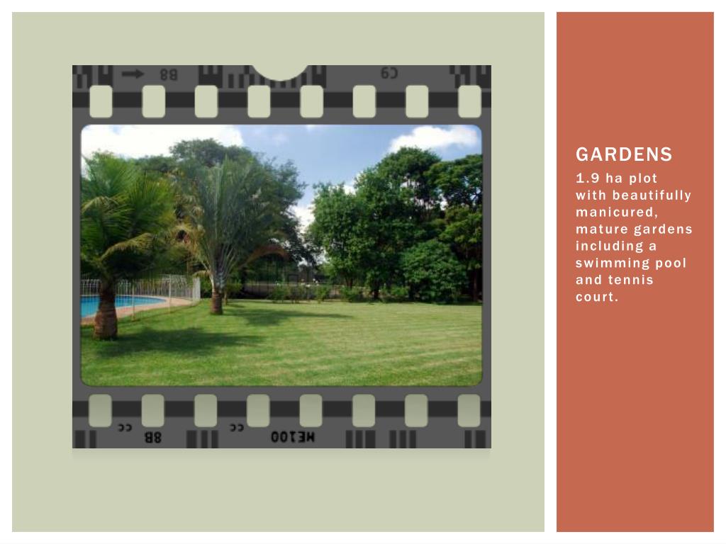 Gardens 1.9 ha plot with beautifully manicured, mature gardens including a swimming pool and tennis court.
