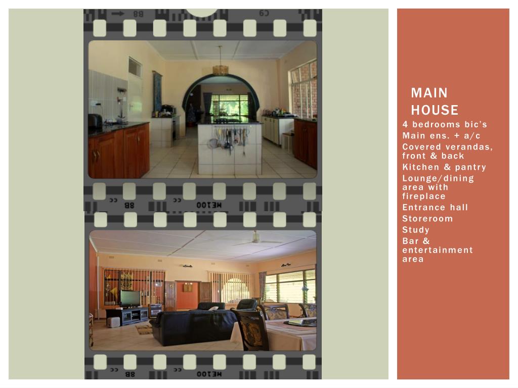 Main House 4 bedrooms bic’s Main ens. + a/c Covered verandas, front & back Kitchen & pantry Lounge/dining area with fireplace Entrance hall Storeroom Study Bar & entertainment area