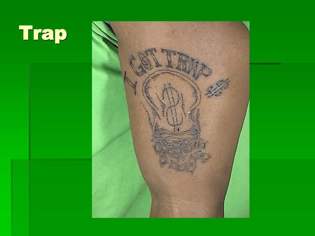 Tattooed Symbols • Like phrases and acronyms, symbols are often displayed in tattoo form by gang members. • These symbols can represent specific gang affiliation. • They also can just be popular icons of general gang culture.