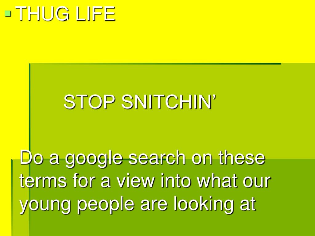 THUG LIFE STOP SNITCHIN’ Do a google search on these terms for a view into what our young people are looking at