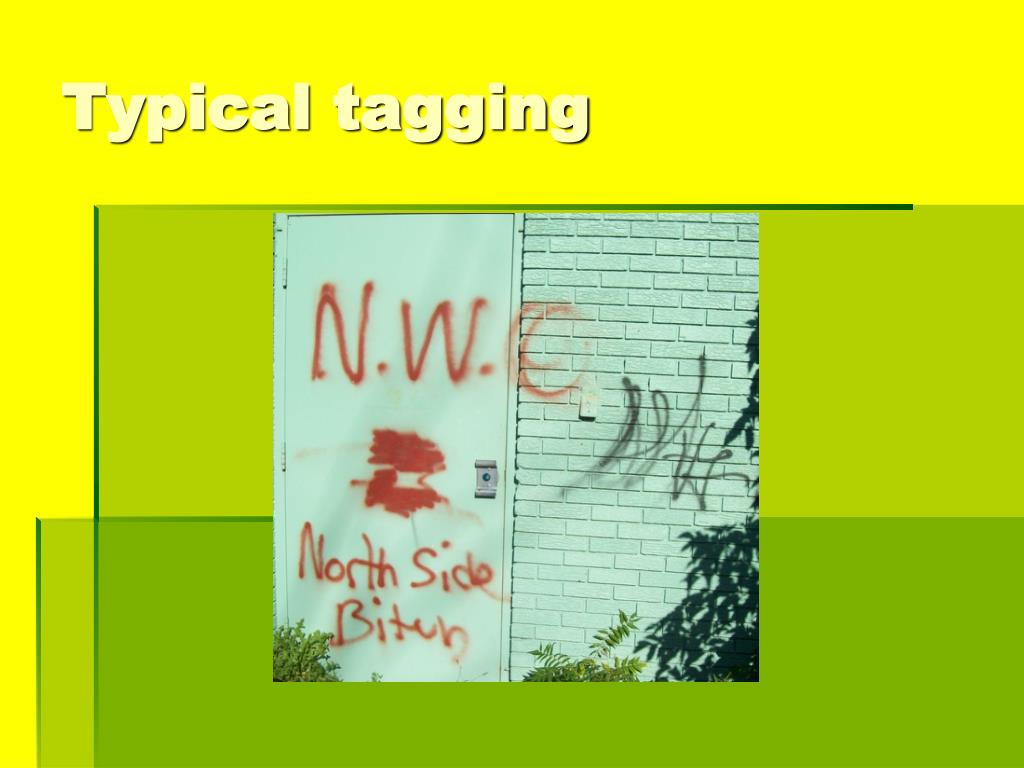 Neighborhood Tags (Graffiti) • Gang members commonly use spray paint to “Mark or Tag Territory” in their neighborhoods, on local businesses and street signs. • When a rival gang is contesting territory they will “X” out the previous tags and mark their own. • Not all graffiti is gang related.