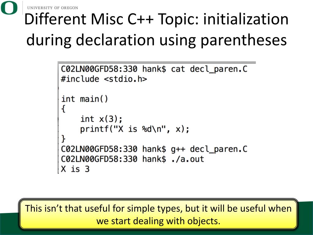 Different Misc C++ Topic: initialization during declaration using parentheses This isn’t that useful for simple types, but it will be useful when we start dealing with objects.