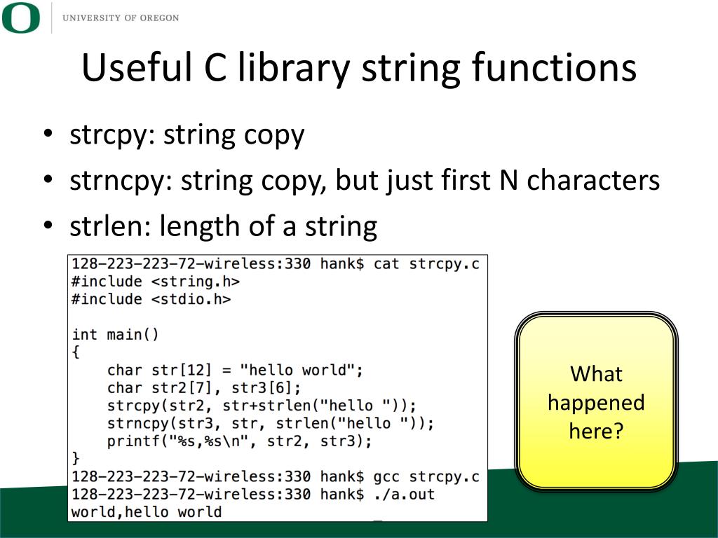 Useful C library string functions • strcpy: string copy • strncpy: string copy, but just first N characters • strlen: length of a string What happened here?