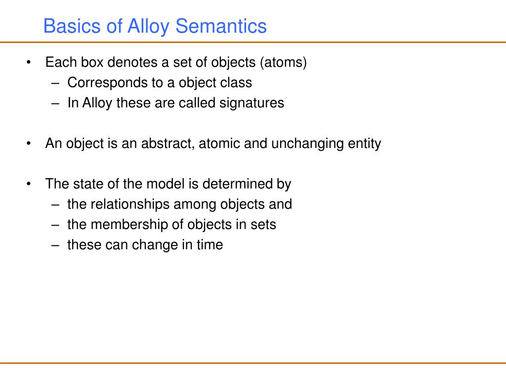 Basics of Alloy Semantics • Each box denotes a set of objects (atoms) • Corresponds to a object class • In Alloy these are called signatures • An object is an abstract, atomic and unchanging entity • The state of the model is determined by • the relationships among objects and • the membership of objects in sets • these can change in time