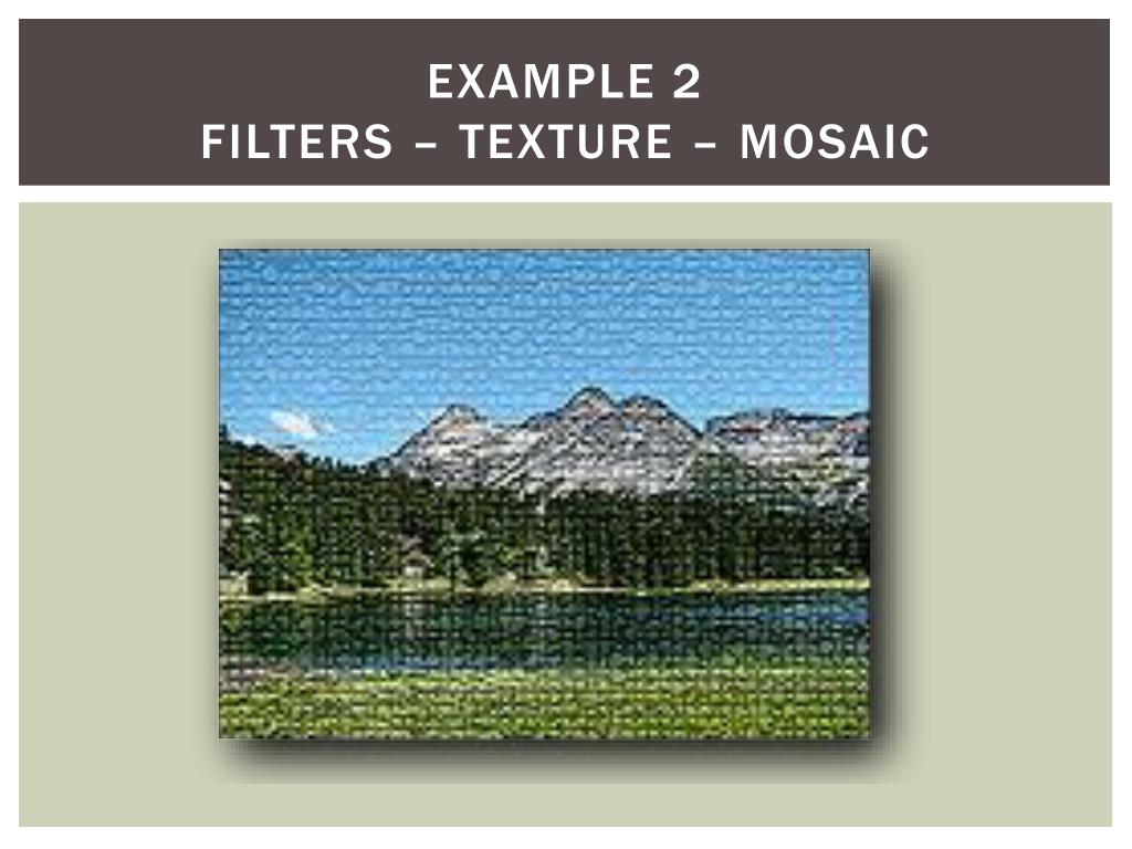 Using Various Filters AND EFFECTSEXAMPLE 2 Sky– Texture – Craquelure Trees – Distort– OceanRipple Mountains– Brush Strokes – Crosshatch Lake – Artistic – Underpainting Background grass – Brush Strokes – SprayedStrokes Front grass – Texture – Texturizer