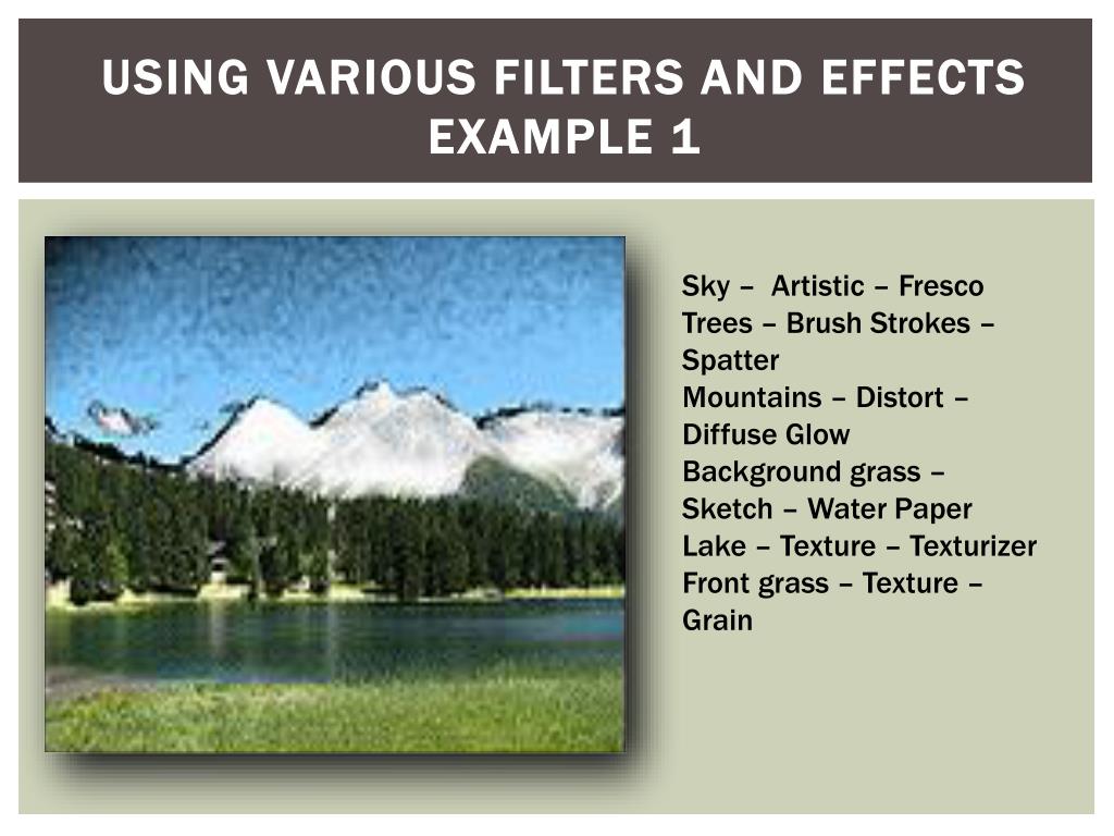 Using various filters and effects example 3 Sky– Artistic- Glass Trees– Brush Strokes – InkOutlines Mountains– Distort– Diffuse Glow Lake – Brush Strokes – AccentedEdges Background grass – Artistic– ColoredPencil Front grass– Distort– OceanRipple