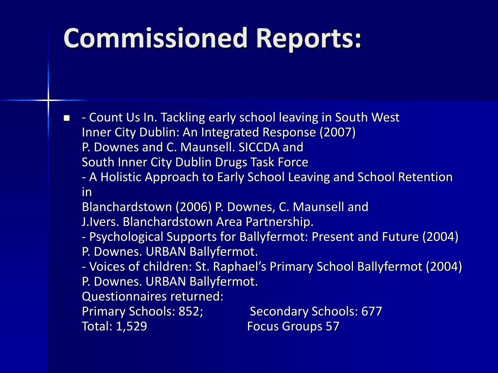 Commissioned Reports: • - Count Us In. Tackling early school leaving in South West Inner City Dublin: An Integrated Response (2007) P. Downes and C. Maunsell. SICCDA and South Inner City Dublin Drugs Task Force- A Holistic Approach to Early School Leaving and School Retention in Blanchardstown (2006) P. Downes, C. Maunsell and J.Ivers. Blanchardstown Area Partnership.- Psychological Supports for Ballyfermot: Present and Future (2004) P. Downes. URBAN Ballyfermot.- Voices of children: St. Raphael’s Primary School Ballyfermot (2004) P. Downes. URBAN Ballyfermot.Questionnaires returned:Primary Schools: 852; Secondary Schools: 677Total: 1,529 Focus Groups 57