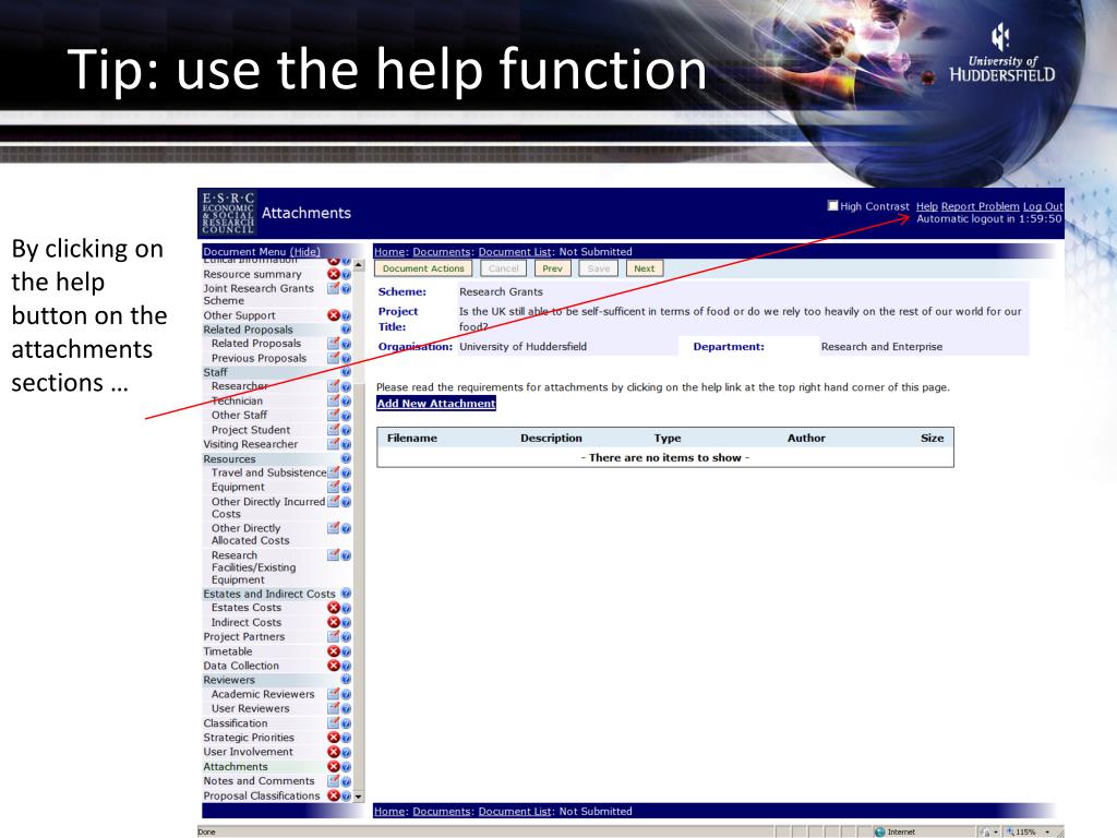 Things to think about • Avoid specialist characters and symbols (e.g. mathematical symbols, bullet points) because these may not transfer successfully. • Every return is counted as a space and will affect the character count. • You need to click save frequently on Je-S! • You should convert your word attachments to pdf format when you are ready to submit and check that they have converted properly. • For text that you are inputting into Je-S, think about typing and saving it in a word doc.