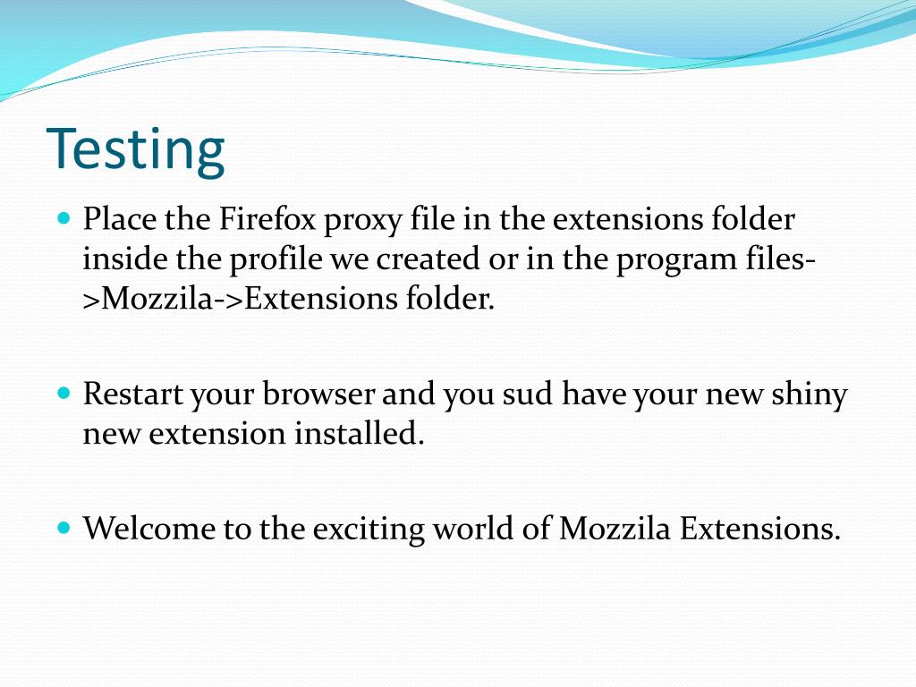 Testing • Place the Firefox proxy file in the extensions folder inside the profile we created or in the program files->Mozzila->Extensions folder. • Restart your browser and you sud have your new shiny new extension installed. • Welcome to the exciting world of Mozzila Extensions.