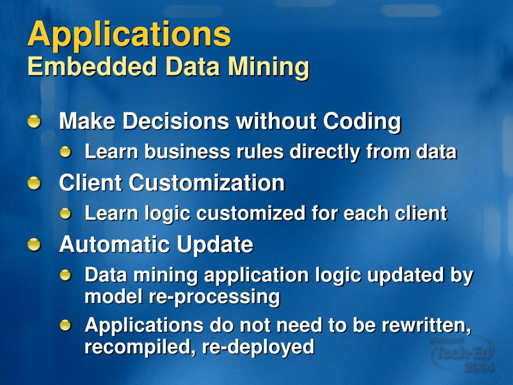 ApplicationsEmbedded Data Mining • Make Decisions without Coding • Learn business rules directly from data • Client Customization • Learn logic customized for each client • Automatic Update • Data mining application logic updated by model re-processing • Applications do not need to be rewritten, recompiled, re-deployed