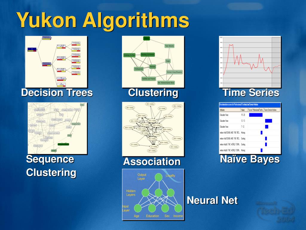 Decision Trees Clustering Time Series Naïve Bayes SequenceClustering Association Neural Net Yukon Algorithms