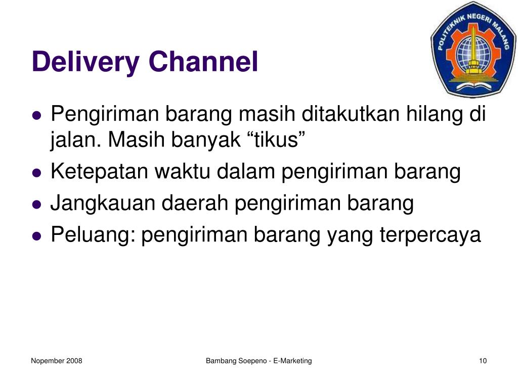 Bambang Soepeno - E-Marketing Delivery Channel Pengiriman barang masih ditakutkan hilang di jalan. Masih banyak “tikus” Ketepatan waktu dalam pengiriman barang Jangkauan daerah pengiriman barang Peluang: pengiriman barang yang terpercaya