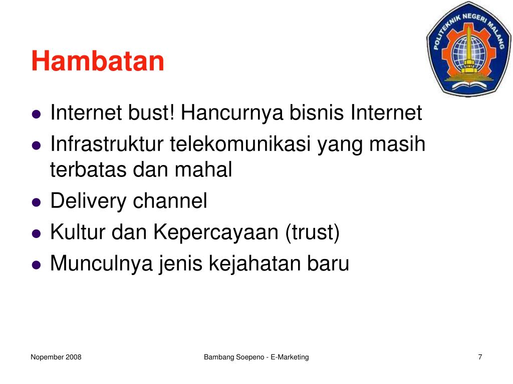 Bambang Soepeno - E-Marketing Hambatan Internet bust! Hancurnya bisnis Internet Infrastruktur telekomunikasi yang masih terbatas dan mahal Delivery channel Kultur dan Kepercayaan (trust) Munculnya jenis kejahatan baru
