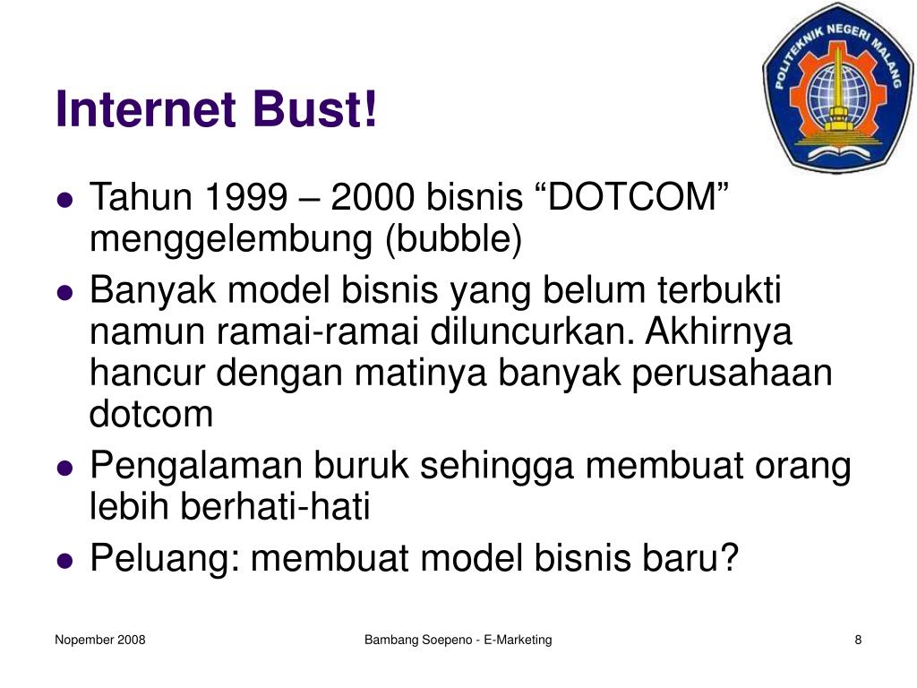 Bambang Soepeno - E-Marketing Internet Bust! Tahun 1999 – 2000 bisnis “DOTCOM” menggelembung (bubble) Banyak model bisnis yang belum terbukti namun ramai-ramai diluncurkan. Akhirnya hancur dengan matinya banyak perusahaan dotcom Pengalaman buruk sehingga membuat orang lebih berhati-hati Peluang: membuat model bisnis baru?