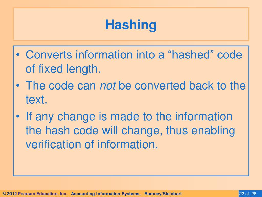 Hashing • Converts information into a “hashed” code of fixed length. • The code can not be converted back to the text. • If any change is made to the information the hash code will change, thus enabling verification of information.