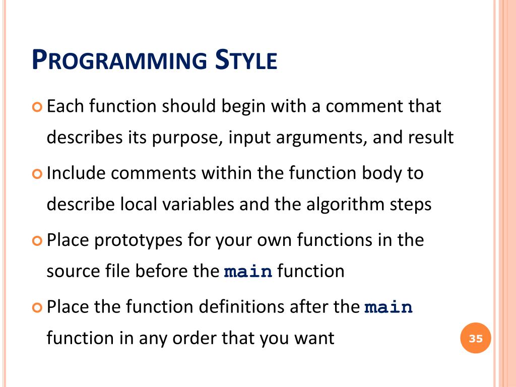 Programming Style • Each function should begin with a comment that describes its purpose, input arguments, and result • Include comments within the function body to describe local variables and the algorithm steps • Place prototypes for your own functions in the source file before the mainfunction • Place the function definitions after the mainfunction in any order that you want