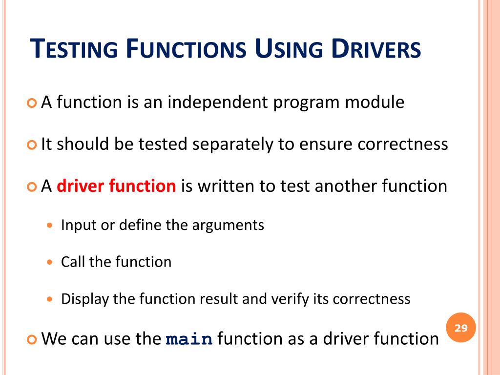 Testing Functions Using Drivers • A function is an independent program module • It should be tested separately to ensure correctness • A driver function is written to test another function • Input or define the arguments • Call the function • Display the function result and verify its correctness • We can use the main function as a driver function