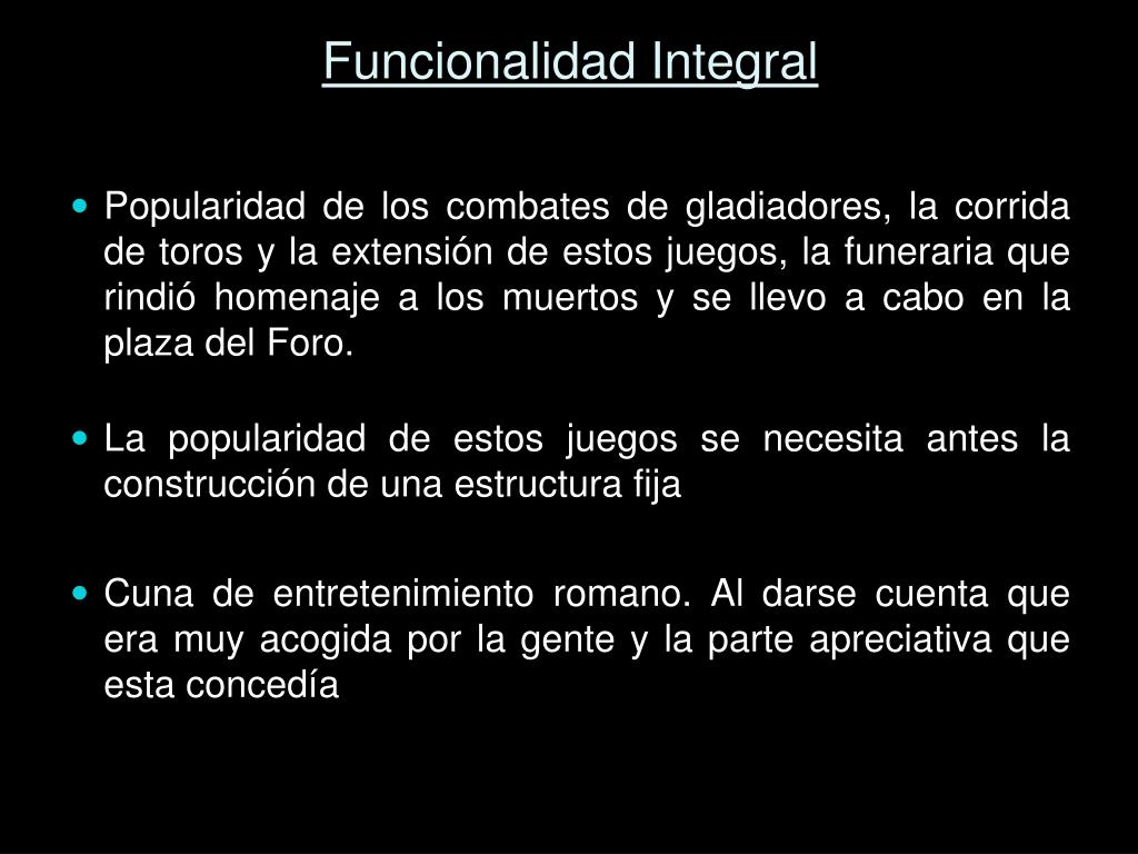 Funcionalidad Integral • Popularidad de los combates de gladiadores, la corrida de toros y la extensión de estos juegos, la funeraria que rindió homenaje a los muertos y se llevo a cabo en la plaza del Foro. • La popularidad de estos juegos se necesita antes la construcción de una estructura fija • Cuna de entretenimiento romano. Al darse cuenta que era muy acogida por la gente y la parte apreciativa que esta concedía