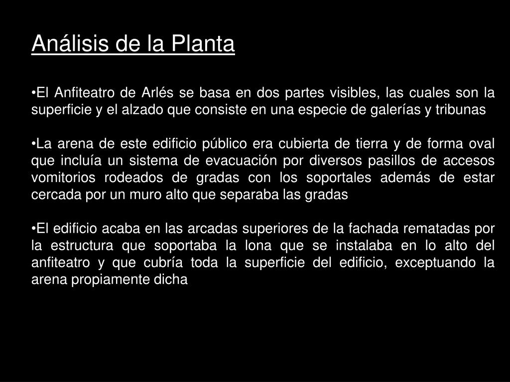 Análisis de la Planta • El Anfiteatro de Arlés se basa en dos partes visibles, las cuales son la superficie y el alzado que consiste en una especie de galerías y tribunas • La arena de este edificio público era cubierta de tierra y de forma oval que incluía un sistema de evacuación por diversos pasillos de accesos vomitorios rodeados de gradas con los soportales además de estar cercada por un muro alto que separaba las gradas • El edificio acaba en las arcadas superiores de la fachada rematadas por la estructura que soportaba la lona que se instalaba en lo alto del anfiteatro y que cubría toda la superficie del edificio, exceptuando la arena propiamente dicha