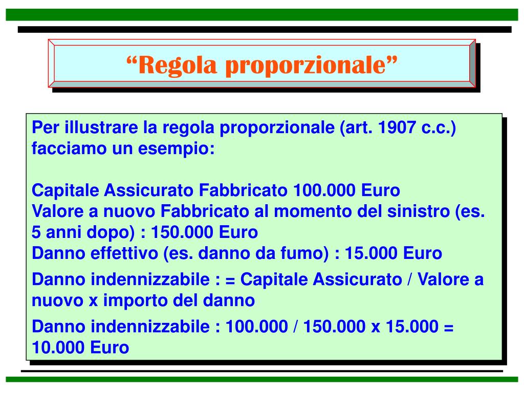 “Regola proporzionale” Per illustrare la regola proporzionale (art. 1907 c.c.) facciamo un esempio: Capitale Assicurato Fabbricato 100.000 Euro Valore a nuovo Fabbricato al momento del sinistro (es. 5 anni dopo) : 150.000 Euro Danno effettivo (es. danno da fumo) : 15.000 Euro Danno indennizzabile : = Capitale Assicurato / Valore a nuovo x importo del danno Danno indennizzabile : 100.000 / 150.000 x 15.000 = 10.000 Euro