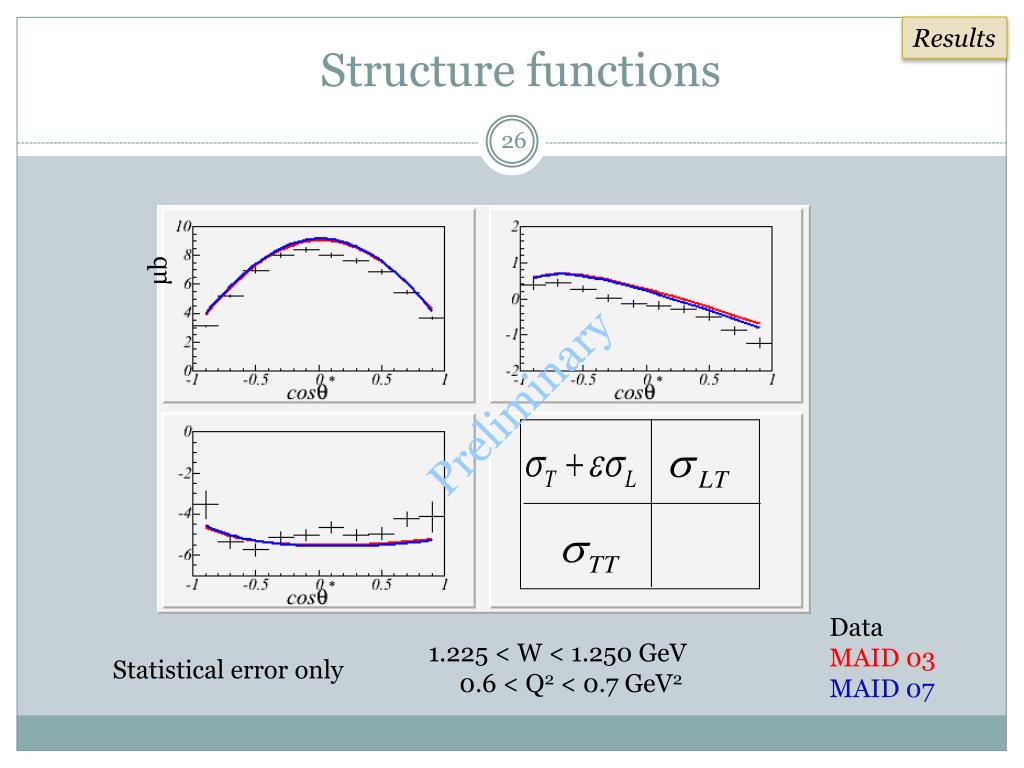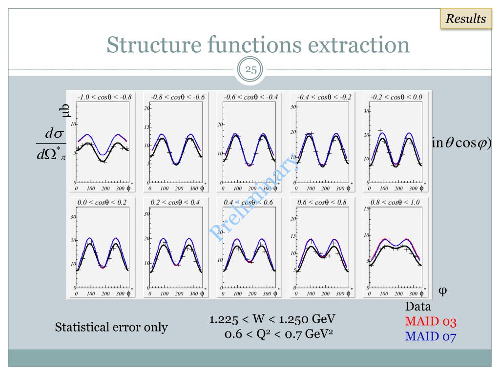 Results Structure functions extraction μb Preliminary Very preliminary φ Data MAID 03 MAID 07 1.225 < W < 1.250 GeV 0.6 < Q2 < 0.7 GeV2 Statistical error only