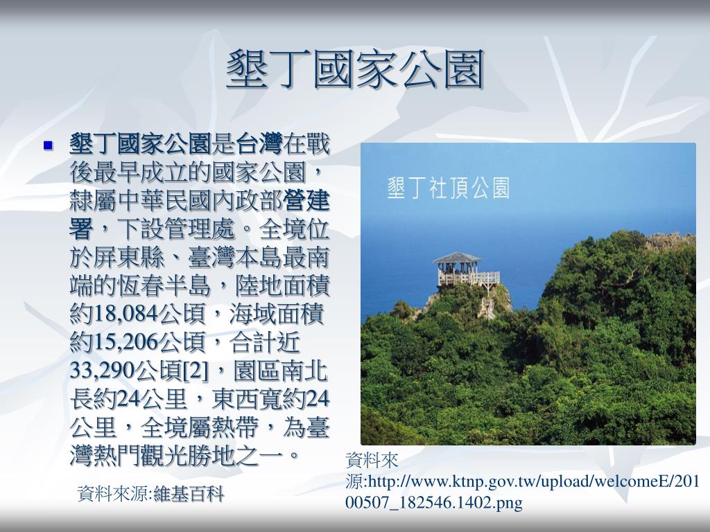 墾丁國家公園 • 墾丁國家公園是台灣在戰後最早成立的國家公園,隸屬中華民國內政部營建署,下設管理處。全境位於屏東縣、臺灣本島最南端的恆春半島,陸地面積約18,084公頃,海域面積約15,206公頃,合計近33,290公頃[2],園區南北長約24公里,東西寬約24公里,全境屬熱帶,為臺灣熱門觀光勝地之一。 資料來源:http://www.ktnp.gov.tw/upload/welcomeE/20100507_182546.1402.png 資料來源:維基百科