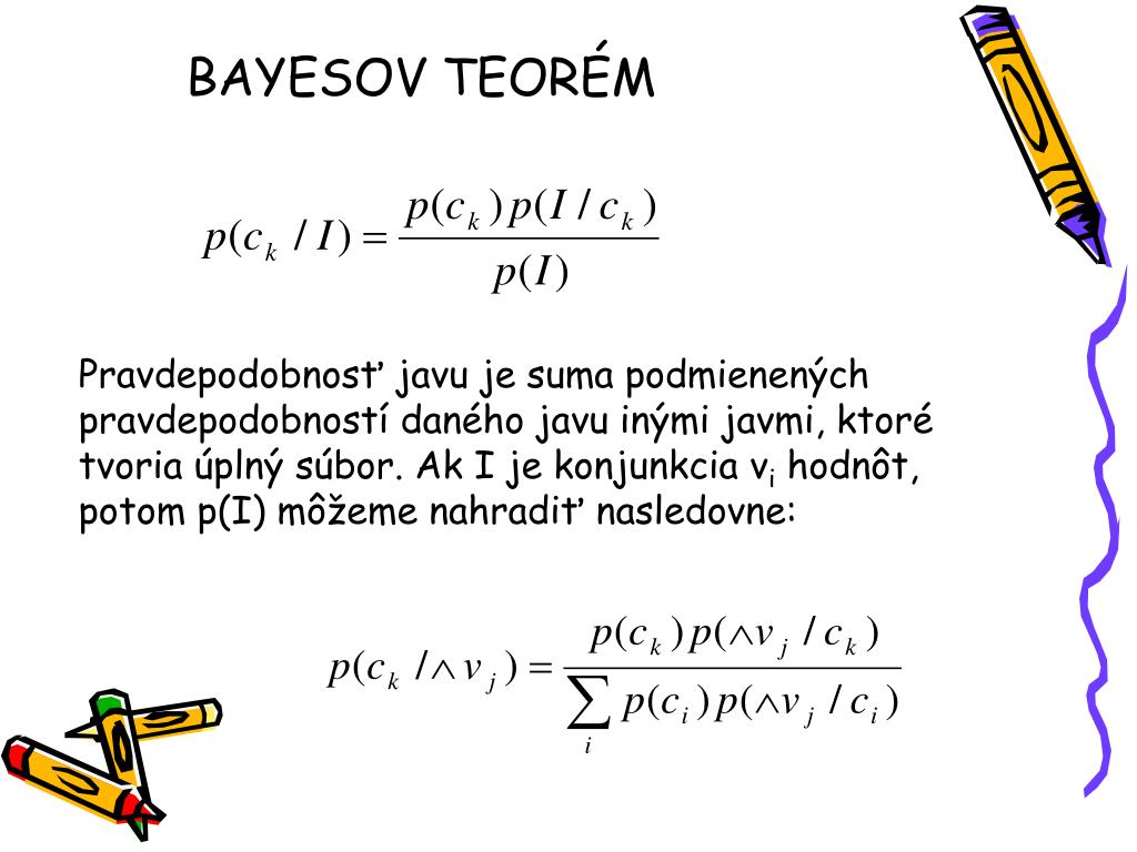 BAYESOV TEORÉM Pravdepodobnosť javu je suma podmienených pravdepodobností daného javu inými javmi, ktoré tvoria úplný súbor. Ak I je konjunkcia vi hodnôt, potom p(I) môžeme nahradiť nasledovne: