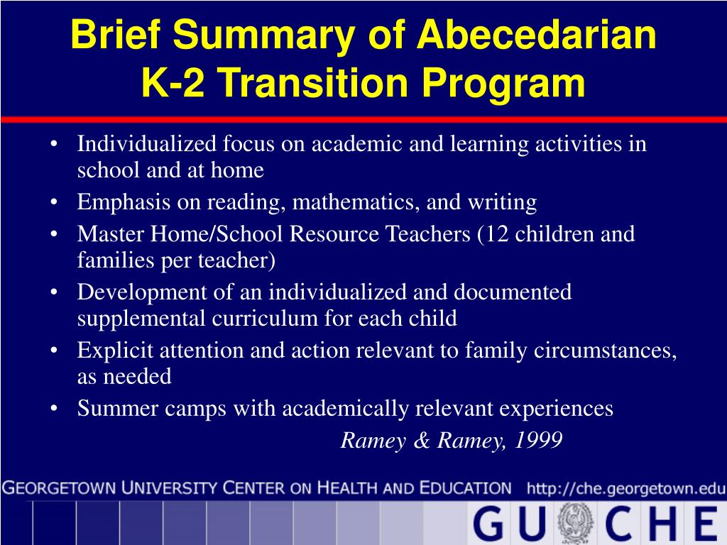 Brief Summary of Abecedarian K-2 Transition Program • Individualized focus on academic and learning activities in school and at home • Emphasis on reading, mathematics, and writing • Master Home/School Resource Teachers (12 children and families per teacher) • Development of an individualized and documented supplemental curriculum for each child • Explicit attention and action relevant to family circumstances, as needed • Summer camps with academically relevant experiences Ramey & Ramey, 1999