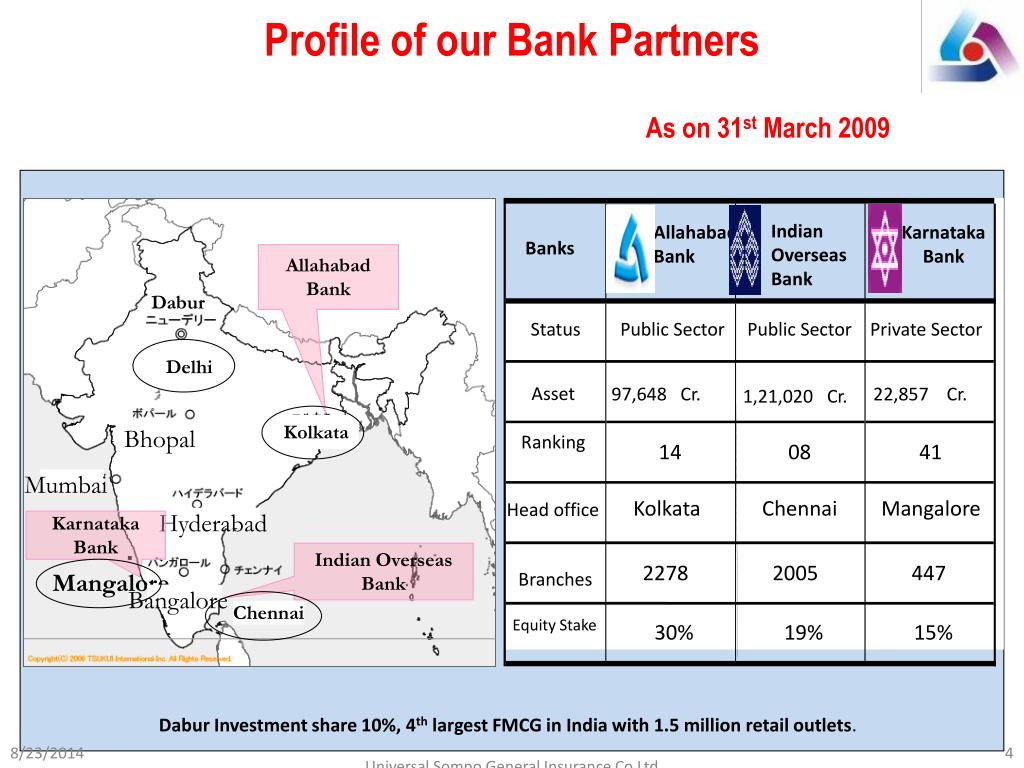 Allahabad Bank Dabur Delhi Kolkata Bhopal Mumbai Hyderabad Karnataka Bank ・ Indian Overseas Bank Mangalore Bangalore Chennai Profile of our Bank Partners As on 31st March 2009 Indian Overseas Bank Allahabad Bank Karnataka Bank Banks Status Public Sector Public Sector Private Sector Asset 97,648 Cr. 22,857 Cr. 1,21,020 Cr. Ranking 14 08 41 Kolkata Chennai Mangalore Head office 2278 2005 447 Branches Equity Stake 30% 19% 15% Dabur Investment share 10%, 4th largest FMCG in India with 1.5 million retail outlets. Universal Sompo General Insurance Co Ltd