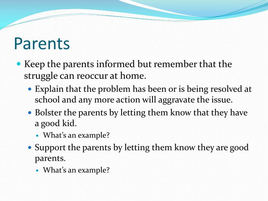 Parents • Keep the parents informed but remember that the struggle can reoccur at home. • Explain that the problem has been or is being resolved at school and any more action will aggravate the issue. • Bolster the parents by letting them know that they have a good kid. • What’s an example? • Support the parents by letting them know they are good parents. • What’s an example?