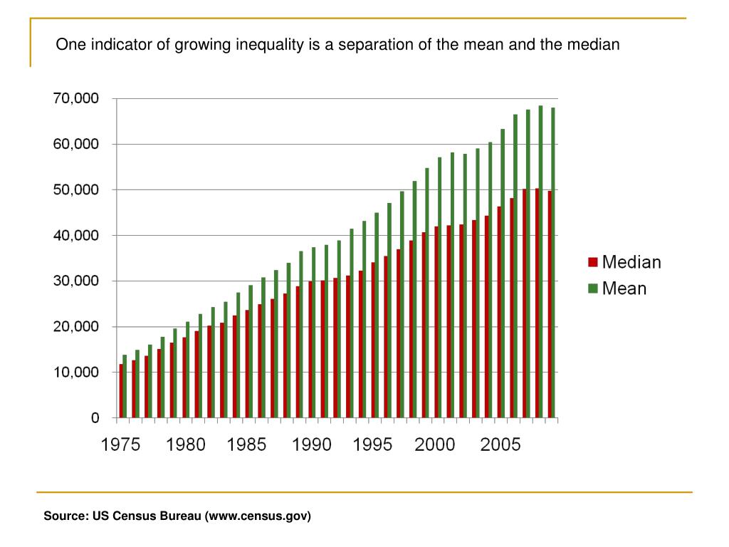 One indicator of growing inequality is a separation of the mean and the median Source: US Census Bureau (www.census.gov)