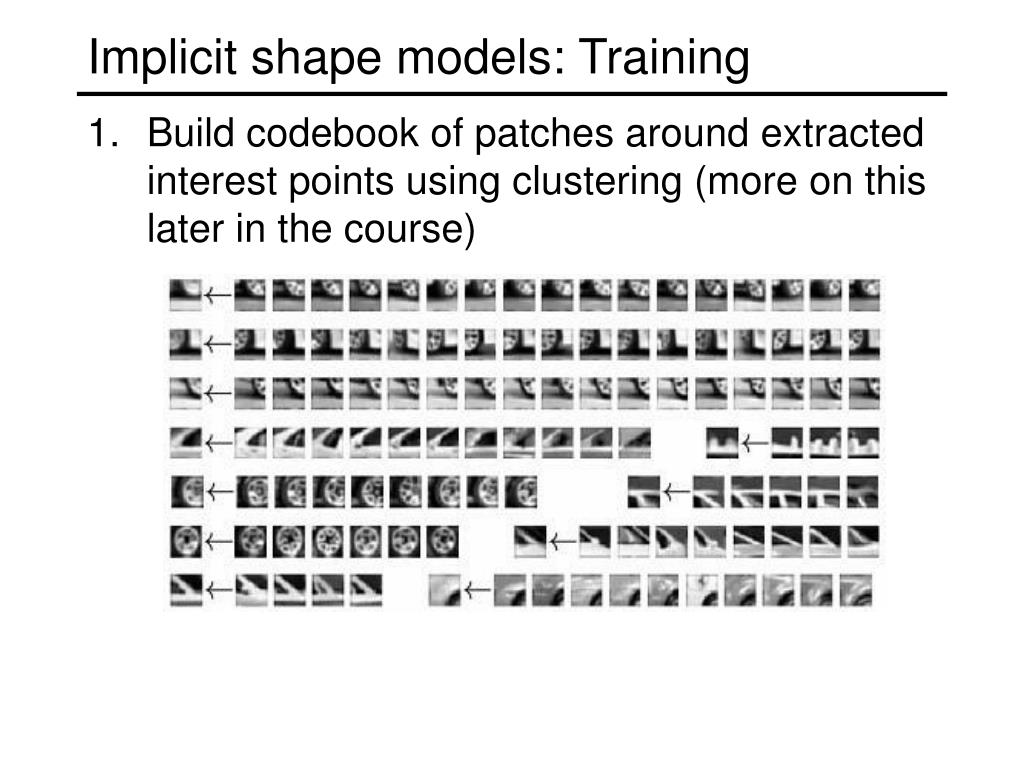 Implicit shape models: Training • Build codebook of patches around extracted interest points using clustering • Map the patch around each interest point to closest codebook entry