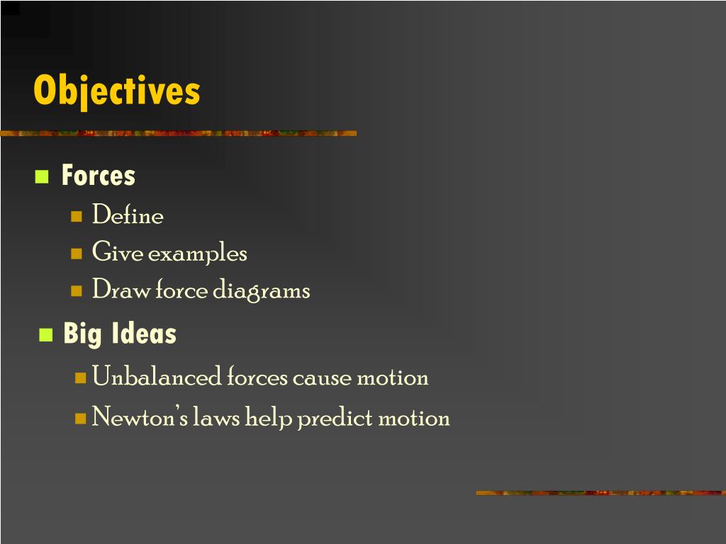 Objectives • Forces • Define • Give examples • Draw force diagrams • Big Ideas • Unbalanced forces cause motion • Newton’s laws help predict motion