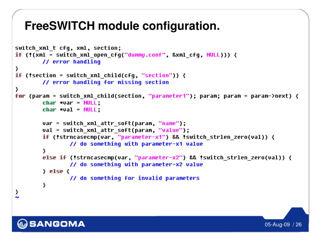 FreeSWITCH module configuration. • Assuming we have an application configuration like this: <configuration name=”myconf.conf” description=“test config”> <section> <parameter name=“parameter-x1” value=“123”/> <parameter name=“parameter-x2” value=“456”/> </section> </configuration>