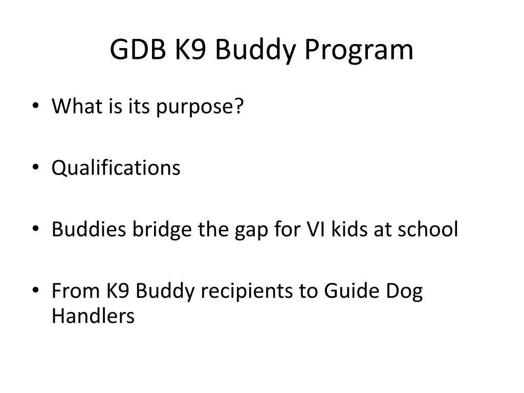 GDB K9 Buddy Program • What is its purpose? • Qualifications • Buddies bridge the gap for VI kids at school • From K9 Buddy recipients to Guide Dog Handlers