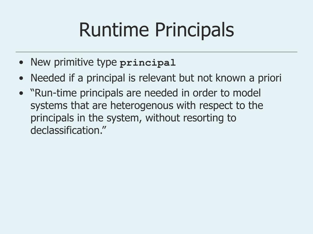 Runtime Principals • New primitive type principal • Needed if a principal is relevant but not known a priori • “Run-time principals are needed in order to model systems that are heterogenous with respect to the principals in the system, without resorting to declassification.”