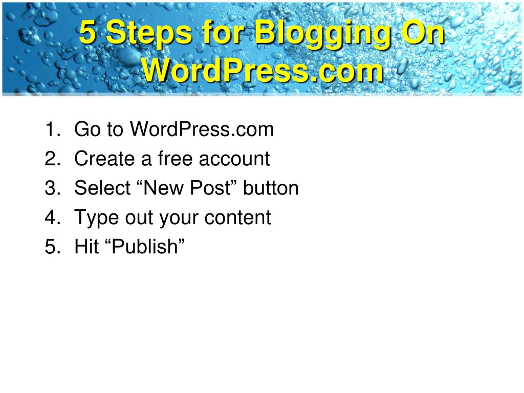 5 Steps for Blogging On WordPress.com • Go to WordPress.com • Create a free account • Select “New Post” button • Type out your content • Hit “Publish”