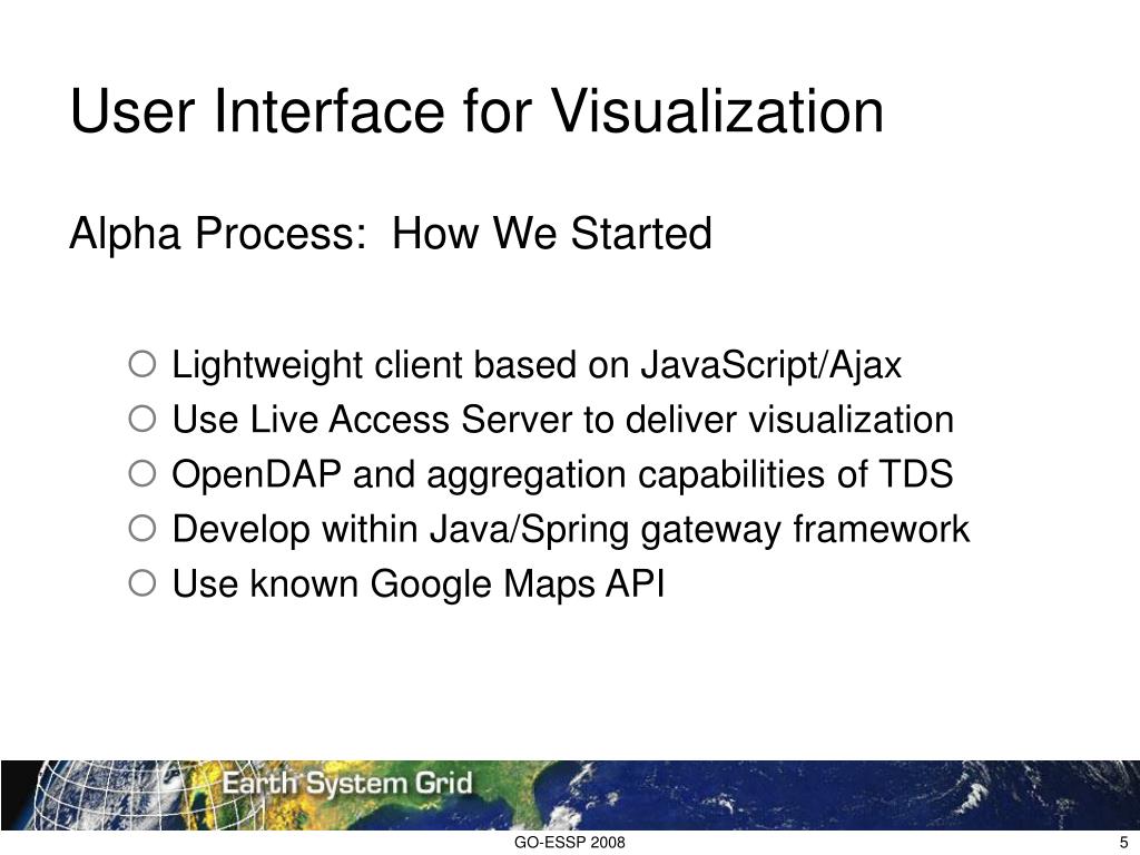 User Interface for Visualization Alpha Process: How We Started • Lightweight client based on JavaScript/Ajax • Use Live Access Server to deliver visualization • OpenDAP and aggregation capabilities of TDS • Develop within Java/Spring gateway framework • Use known Google Maps API GO-ESSP 2008