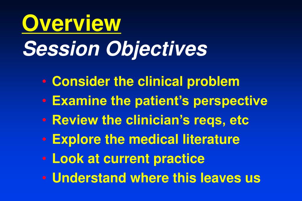 OverviewSession Objectives • Consider the clinical problem • Examine the patient’s perspective • Review the clinician’s reqs, etc • Explore the medical literature • Look at current practice • Understand where this leaves us