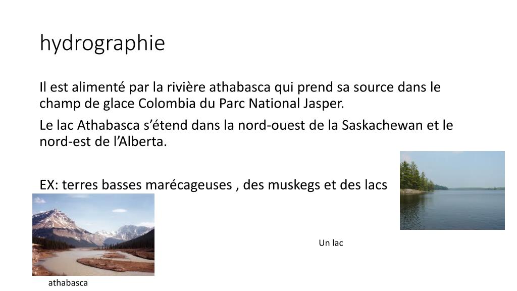 hydrographie Il est alimenté par la rivière athabasca qui prend sa source dans le champ de glace Colombia du Parc National Jasper. Le lac Athabasca s’étend dans la nord-ouest de la Saskachewan et le nord-est de l’Alberta. EX: terres basses marécageuses, des muskegs et des lacs Un lac athabasca