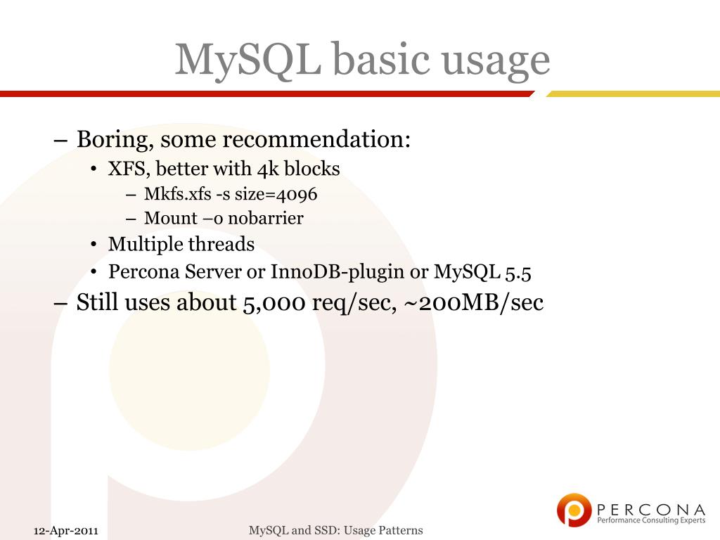MySQL basic usage • Boring, some recommendation: • XFS, better with 4k blocks • Mkfs.xfs -s size=4096 • Mount –o nobarrier • Multiple threads • Percona Server or InnoDB-plugin or MySQL 5.5 • Still uses about 5,000 req/sec, ~200MB/sec MySQL and SSD: Usage Patterns