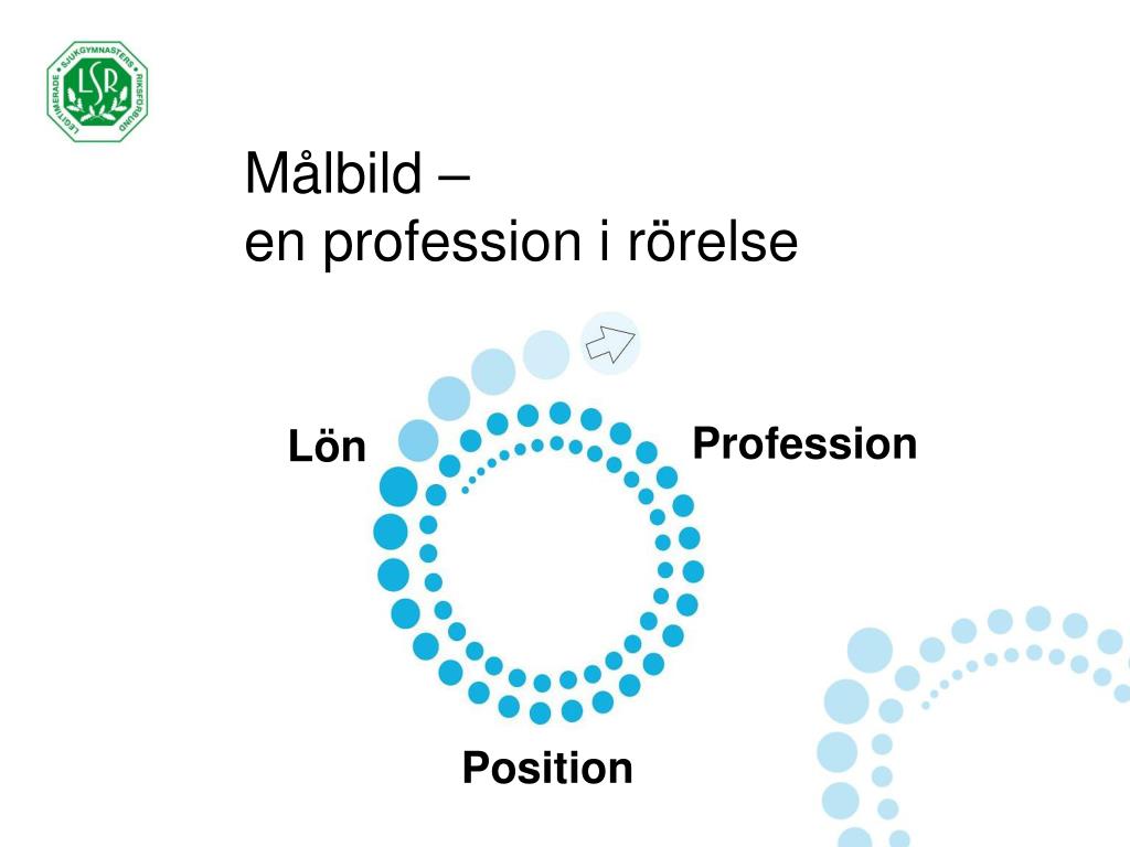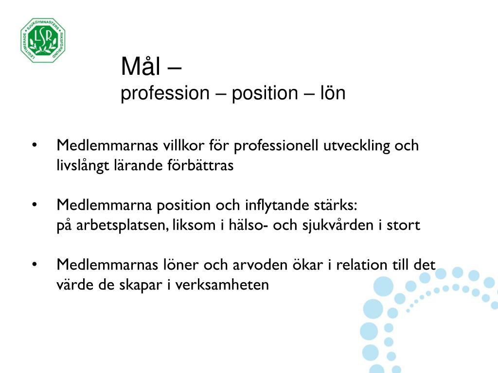 Mål – profession – position – lön • Medlemmarnas villkor för professionell utveckling och livslångt lärande förbättras • Medlemmarna position och inflytande stärks:på arbetsplatsen, liksom i hälso- och sjukvården i stort • Medlemmarnas löner och arvoden ökar i relation till det värde de skapar i verksamheten
