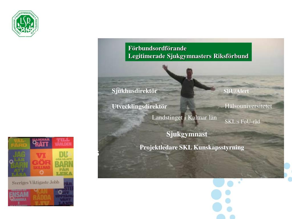 Stefan Jutterdal utvecklingsdirektör Förbundsordförande Legitimerade Sjukgymnasters Riksförbund SjukhusdirektörUtvecklingsdirektör SBU/Alert Hälsouniversitetet Landstinget i Kalmar län SKL:s FoU-råd Från 1 febprojektledare SKLstöd till landstingens utveckling ochkunskapsstyrning Sjukgymnast ProjektledareSKL Kunskapsstyrning