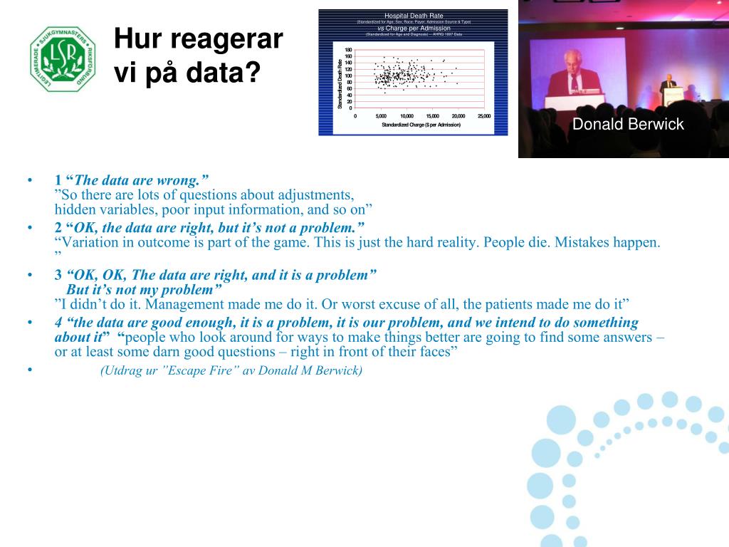 1 “The data are wrong.” ”So there are lots of questions about adjustments, hidden variables, poor input information, and so on” 2 “OK, the data are right, but it’s not a problem.”“Variation in outcome is part of the game. This is just the hard reality. People die. Mistakes happen. ” 3 “OK, OK, The data are right, and it is a problem” But it’s not my problem””I didn’t do it. Management made me do it. Or worst excuse of all, the patients made me do it” 4 “the data are good enough, it is a problem, it is our problem, and we intend to do something about it” “people who look around for ways to make things better are going to find some answers – or at least some darn good questions – right in front of their faces” (Utdrag ur ”Escape Fire” av Donald M Berwick) Hur reagerar vi på data? Donald Berwick