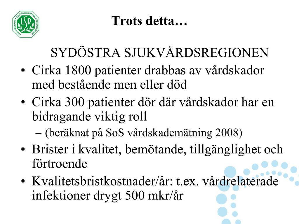 Trots detta… SYDÖSTRA SJUKVÅRDSREGIONEN Cirka 1800 patienter drabbas av vårdskador med bestående men eller död Cirka 300 patienter dör där vårdskador har en bidragande viktig roll (beräknat på SoS vårdskademätning 2008) Brister i kvalitet, bemötande, tillgänglighet och förtroende Kvalitetsbristkostnader/år: t.ex. vårdrelaterade infektioner drygt 500 mkr/år